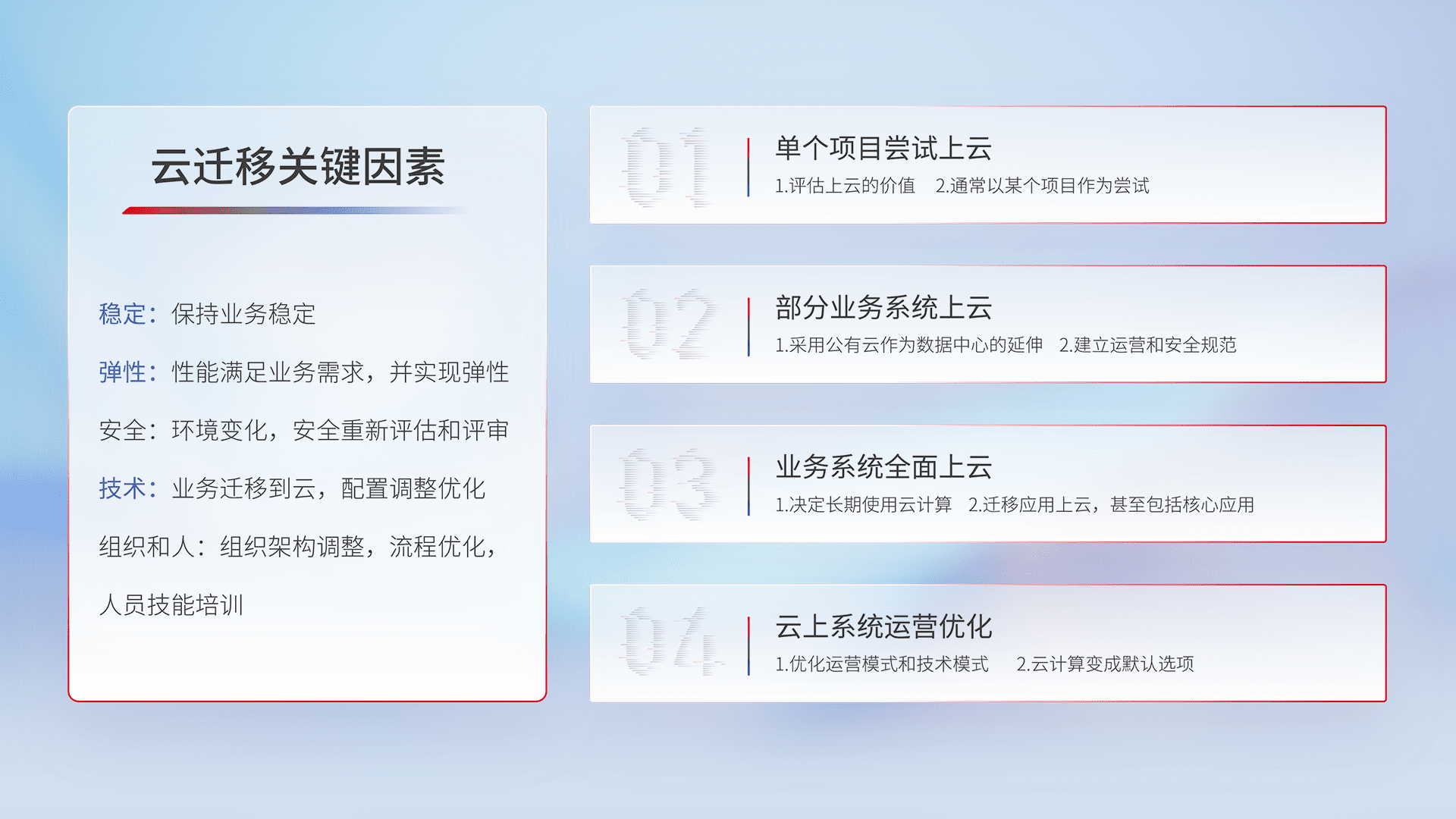 结合实际业务,,,,从规划设计、、、、云平台选型、、、云原生改造、、、、数据迁移、、、集成交付,,迁移全过程为客户识别最佳上云路径,,做好风险识别管理,,,设计网络架构、、、身份权限、、安全审计合规、、操作审计、、日志审计、、监控告警策略、、、多站点容灾设计等,,,,对云上基础设施进行整体规划,,提升IT治理水平,,以满足弹性、、、高可用、、、高性能的需求。。。