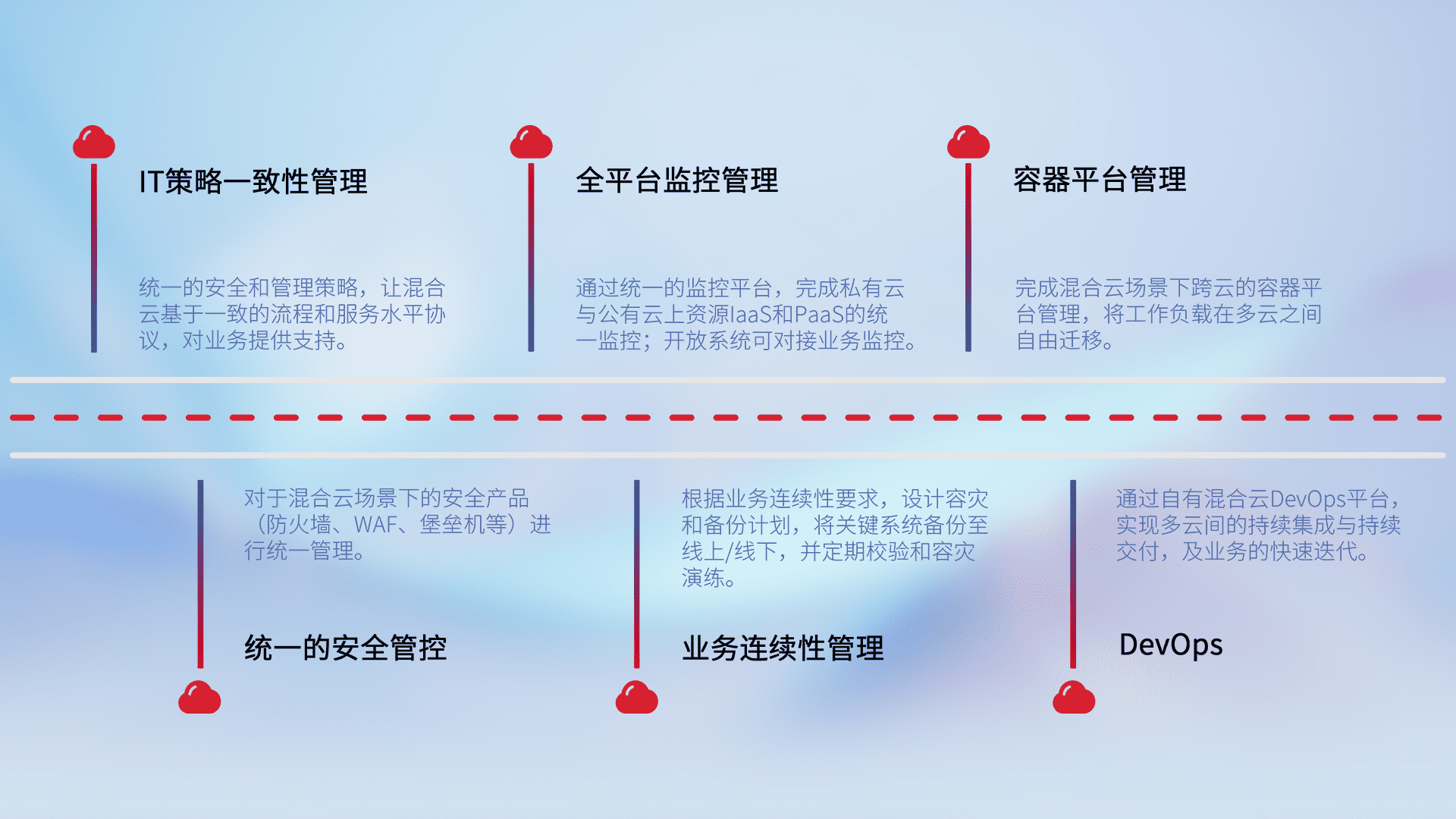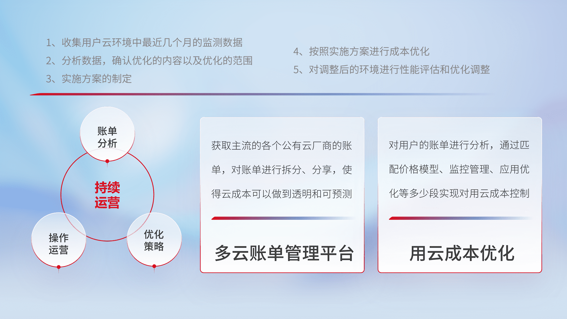 通过多云纳管,,,,以统一的资源数据模型把客户的云资源进行抽象和封装,,进而实现对多云资源的统一操作,,保障云资源管理的可靠性、、、稳定性与可用性。。。。量身定制化运维内容,,,,配置、、开发运维、、补丁管理、、备份、、监控、、、认证和访问管理、、、、审计和日常巡检等,,保障在用云过程中的可靠度,,,稳定度以及高可用率。。。